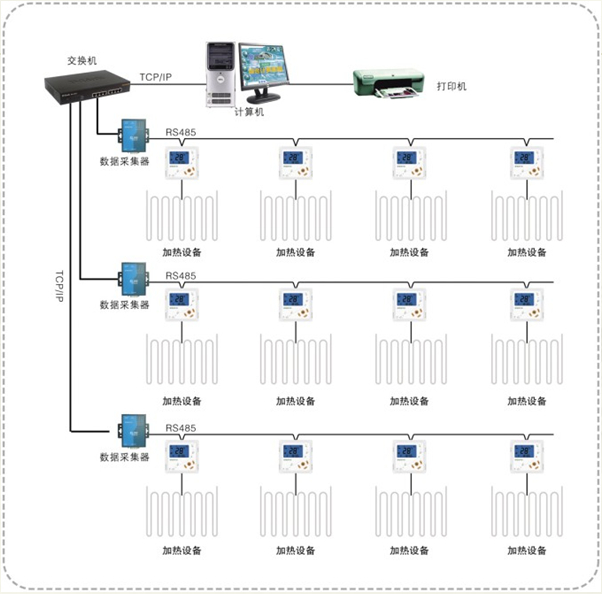軟件系統(tǒng)與采集器的通訊標準為TCP/IP通訊方式。采集器與采暖智能溫度控制器的通訊采用平衡傳輸?shù)腞S485串行總線通訊標準,通訊距離遠,抗干擾能力強。 其中,每—臺電采暖智能溫度控制器獨立完成電伴熱設(shè)備的各種狀態(tài)的數(shù)據(jù)采集和控制任務(wù)。上位機軟件系統(tǒng)以周期詢問的方式與數(shù)據(jù)采集器實現(xiàn)穩(wěn)定的網(wǎng)絡(luò)通訊,數(shù)據(jù)采集器將采集到智能溫度控制器的狀態(tài)上傳至上位機管理中心。上位機軟件系統(tǒng)又將采集到智能溫度控制器的實時狀態(tài)進行邏輯分析,并將 佳控制結(jié)果通過信號控制發(fā)送至智能溫度控制器, 終實現(xiàn)自動化控制。